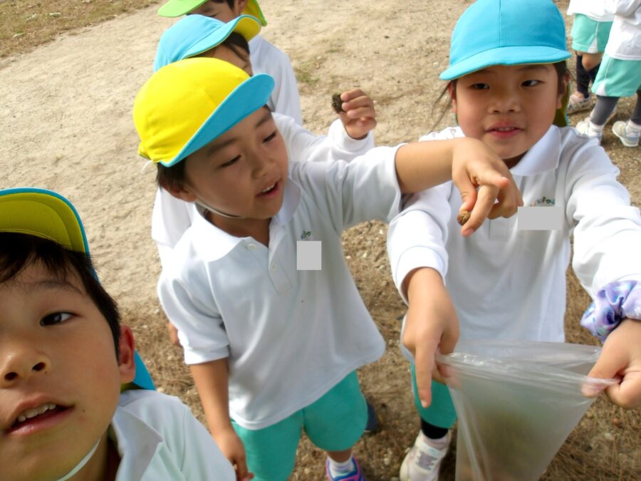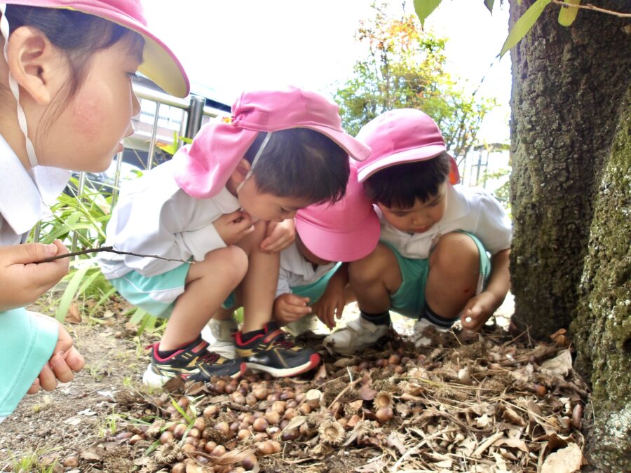 「先生、新しい発見💡こっちのどんぐりの中身は黒かったけど、こっちは黄色い