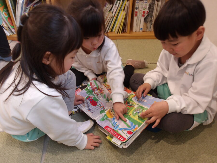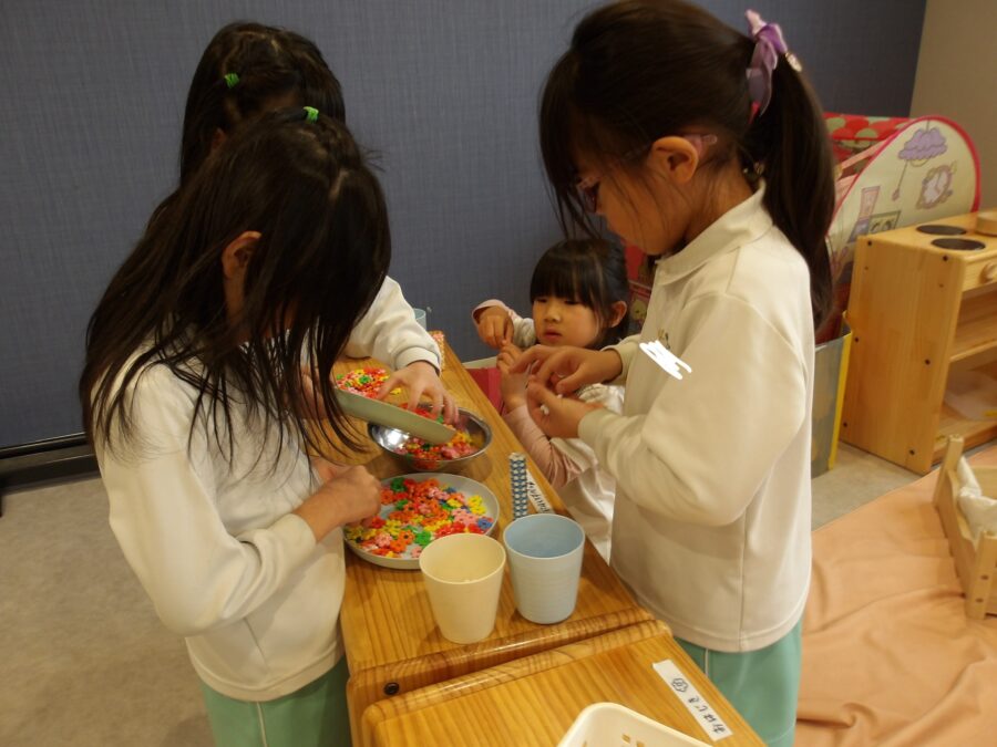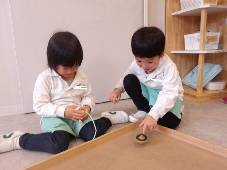 室内遊びでは、おはじきを重ねてタワーのようにして遊んだり、絵本を読んだりこまを回したりなど、いろんな遊びを楽しむ姿がありました![]()