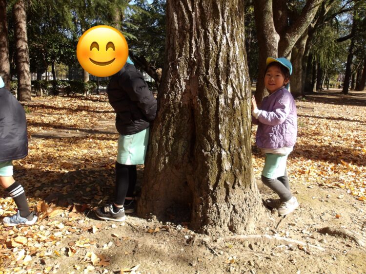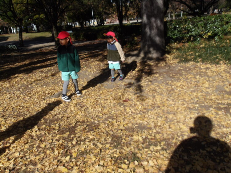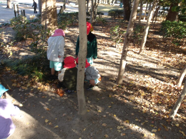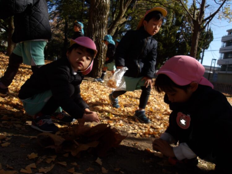 たくさん落ち葉を拾ったり、垣根を上手に使って鬼ごっこしたりと