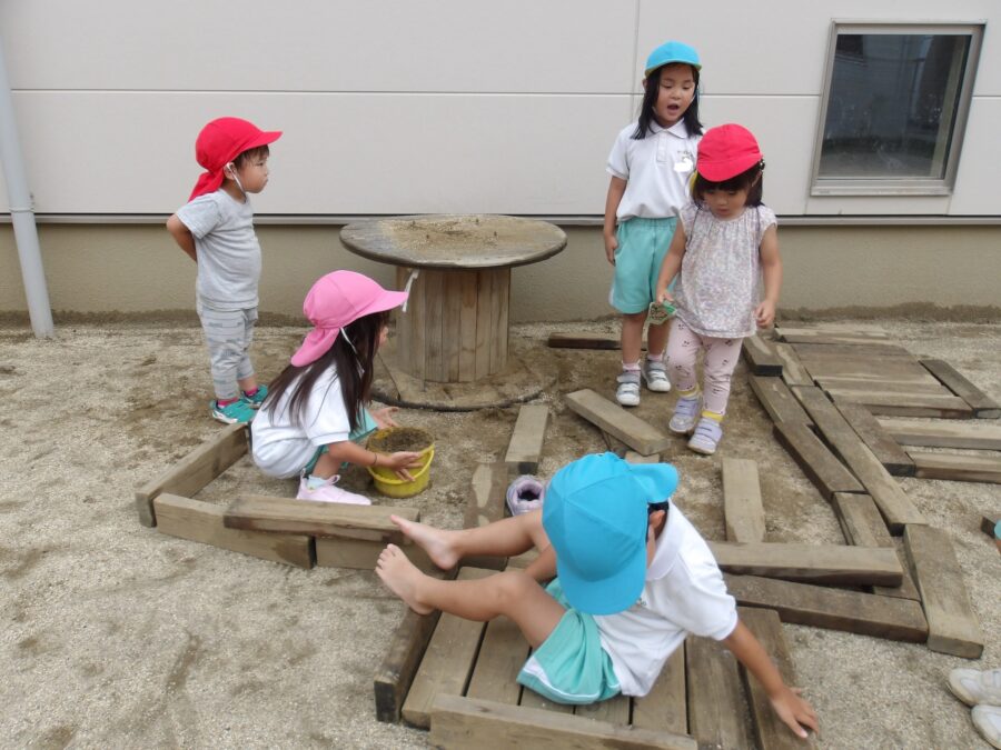 園庭組は木の板でお家を作ったり、三輪車とバイクを乗ったり、砂場で遊びました![]()