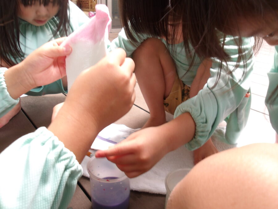 チョンっと角をつけると色水が滲んでいくようすをじっくり観察していました☺️