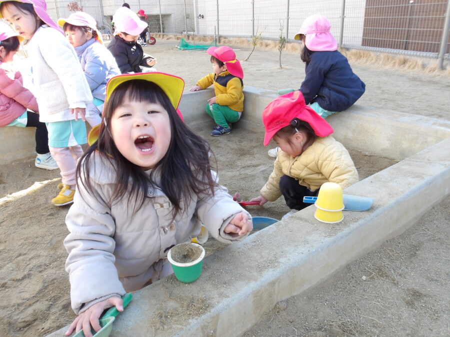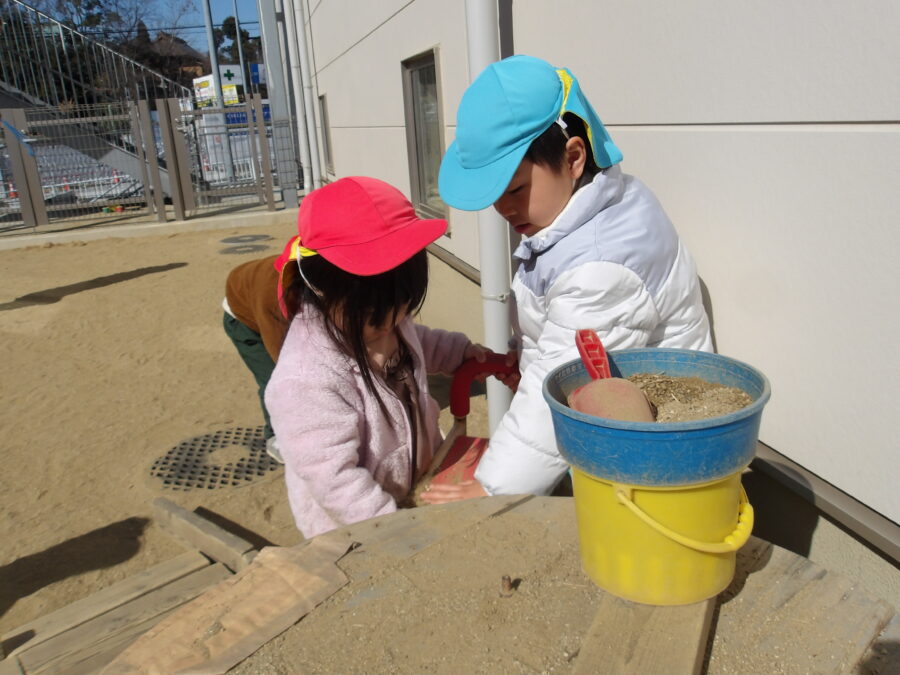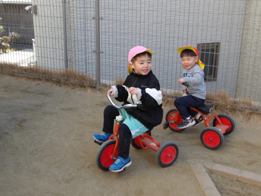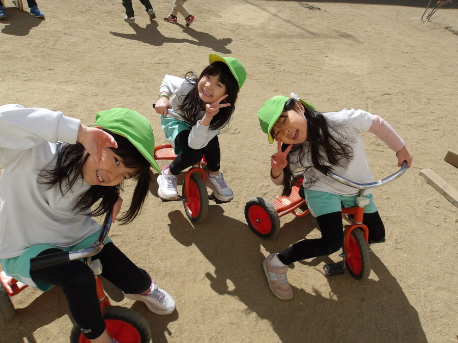 園庭でチームは、三輪車や手押し車遊び、砂場で楽しんでいました![]()