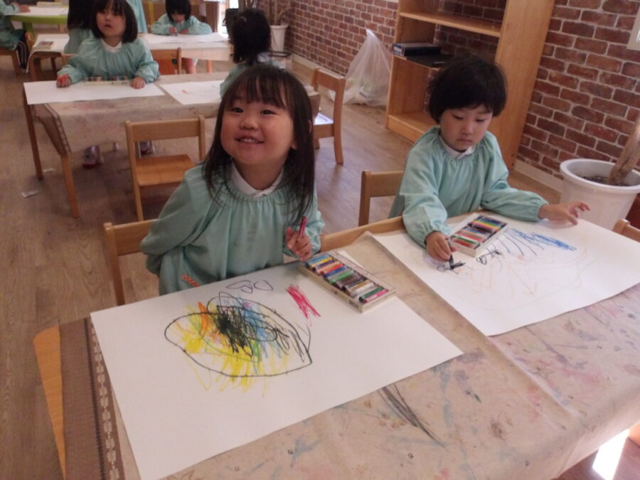 自由に描きながら完成すると「何かけたの〜?」とお友だちにも聞く姿がありましたよ![]()
