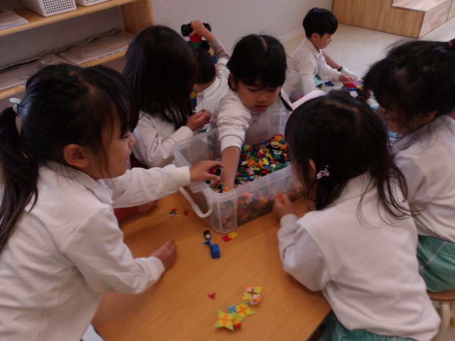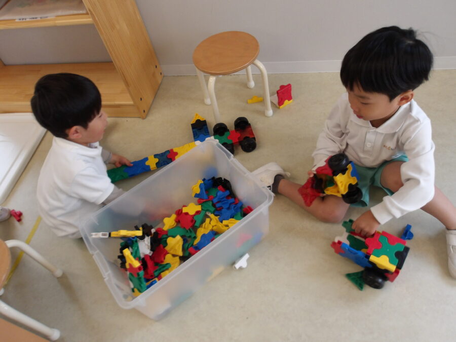 室内遊びでは、ブロックなどのいろんな玩具を使って組み立てたり