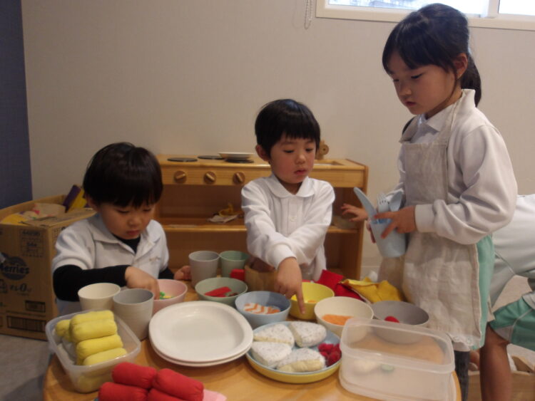 そのあとは室内で、おままごとや折り紙など好きな遊びをしました![]()