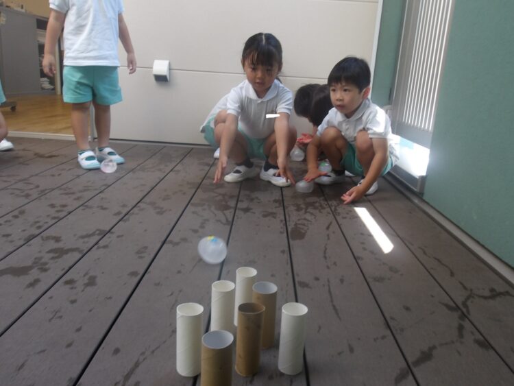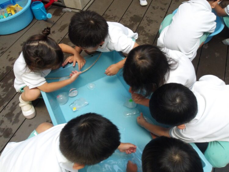 風船の中に水とおはじきをいれて凍らせた氷で遊んだり、氷が水に変化する様子を楽しんだりしました🧊