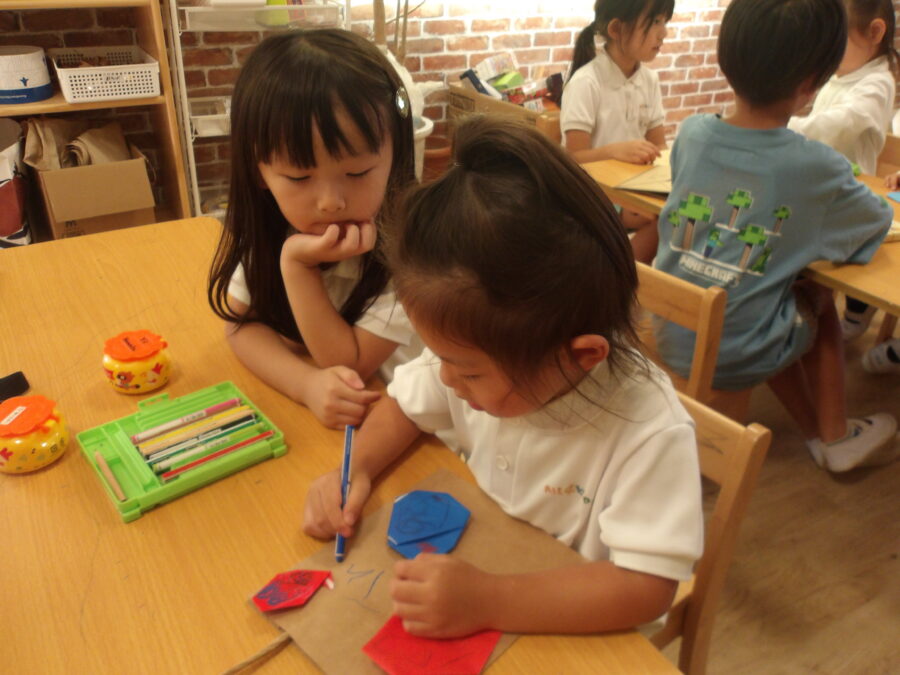 「おばけにする?」「水色がいいの??」「まず、こことここをくっつけて三角にするんだよ」と丁寧に教えてくれていました