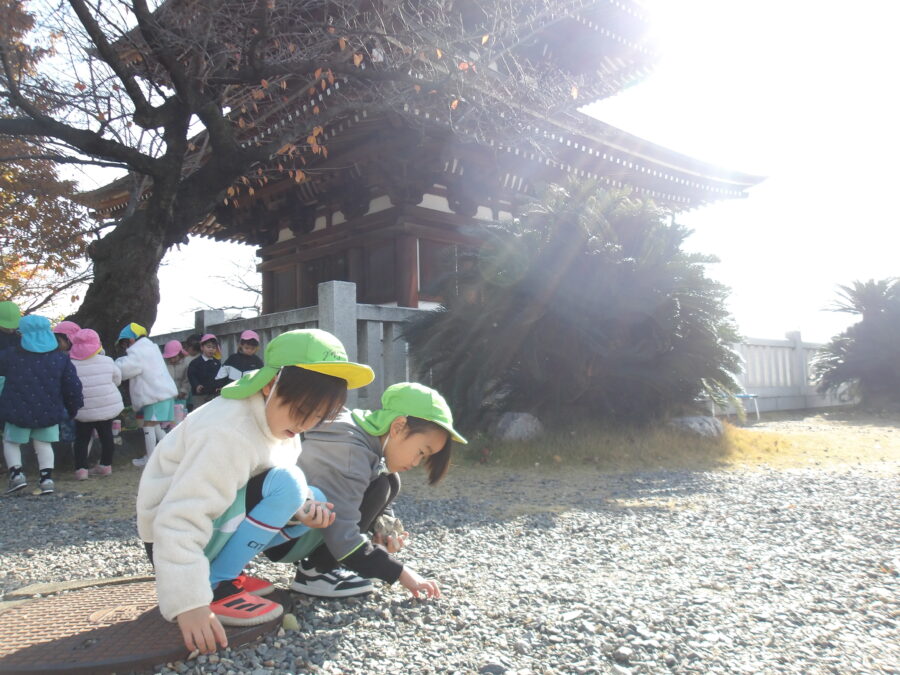 五重塔に着くと、丸々のどんぐりや葉っぱ、いろんな石を見つけて楽しんだり