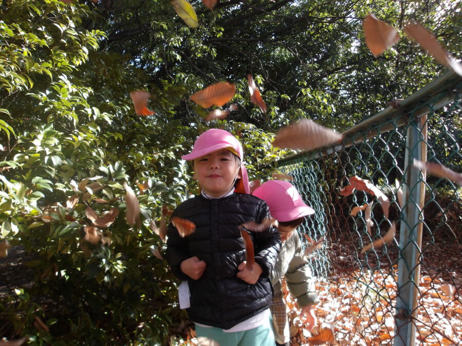 舎利殿に着くと、さっそく落ち葉シャワーやどんぐり探し、
