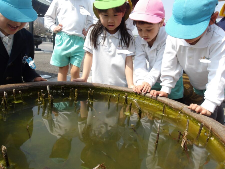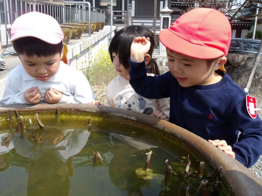 鬼ごっこをしたり綺麗な石を見つけてみたり、メダカを観察したり、違うクラスのお友だちといっしょに遊んでいました🩷