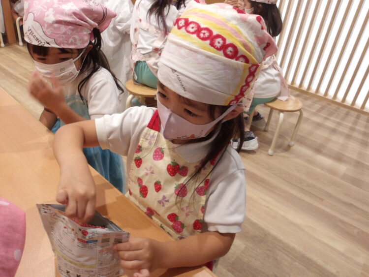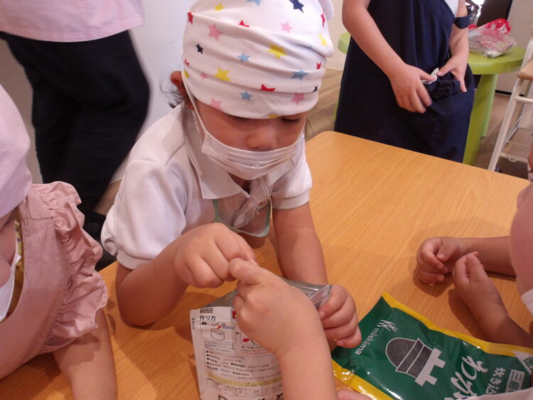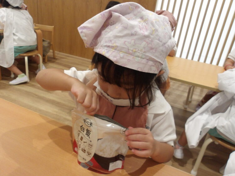 今日は避難訓練のあとにそら組、にじ組、たいよう組の3学年で災害食クッキングをしました!