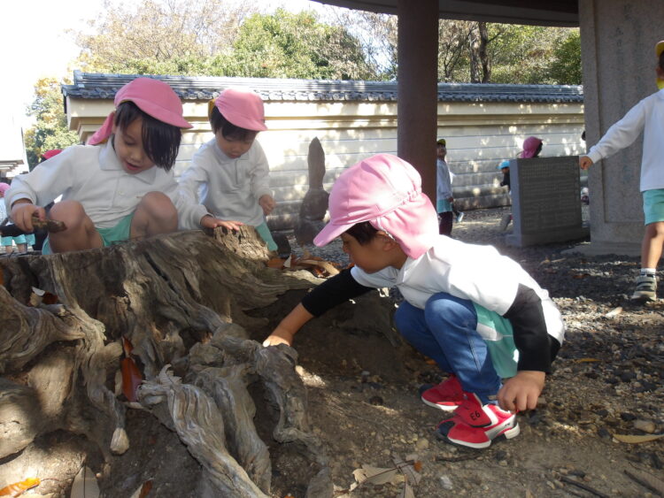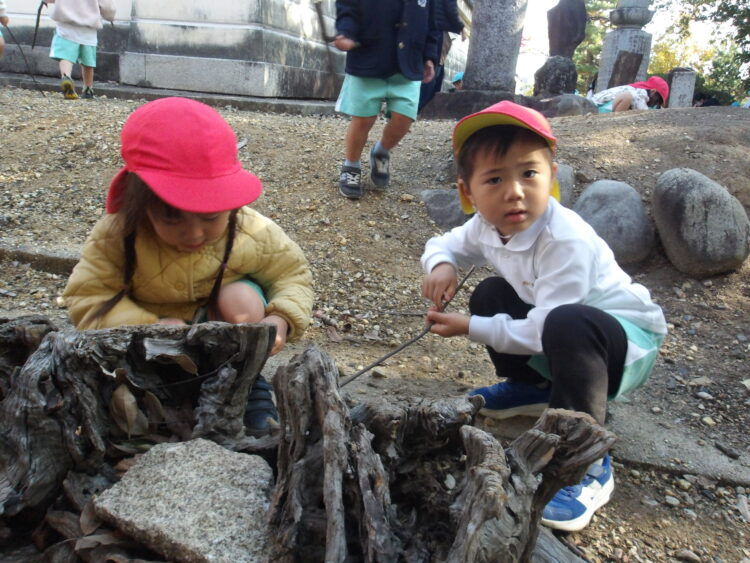 木の幹からどんぐりを見つけたり、枝や石を使ってごっこ遊びも!