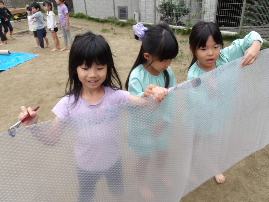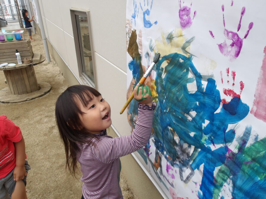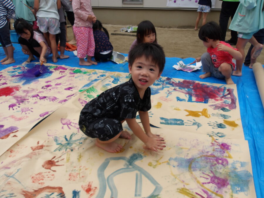 ローラーや筆などを使ってお絵かきをする子もいたり、手のひらや足の裏に塗ってスタンプみたいにしている子もいました😊