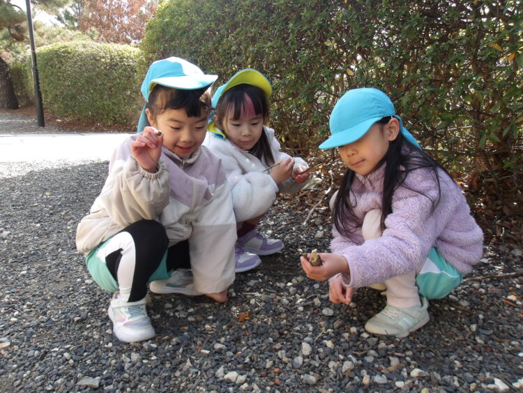 舎利殿へ行ったよ! 今日はみんなで舎利殿へ遊びに行きました! 舎利殿では鬼ごっこを楽しむ子、落ち葉やどんぐりを集めてご飯作りごっこをする子、虫探しをする子様々でした。 楽しかったね! カテゴリ: 覚王山(2~3歳), 覚王山(4~5歳) タグ: