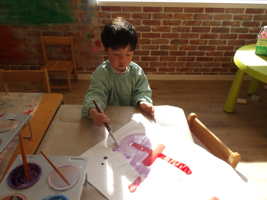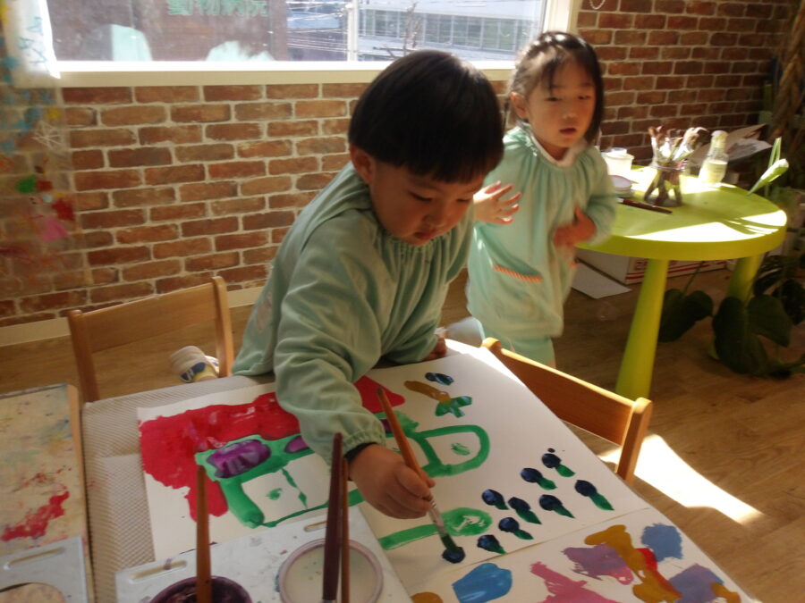 製作ではいろんな色の絵の具を使って絵を描いたり