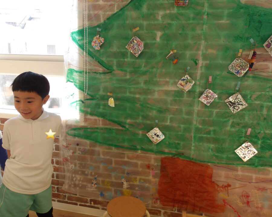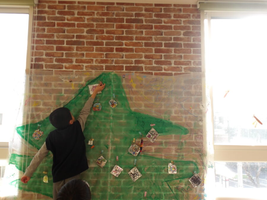 クリスマスツリーの壁面にオーナメントを作って飾りました