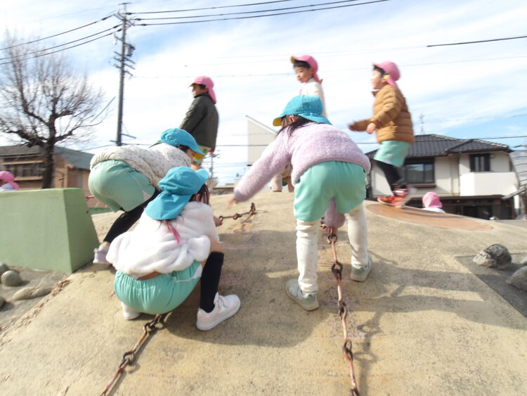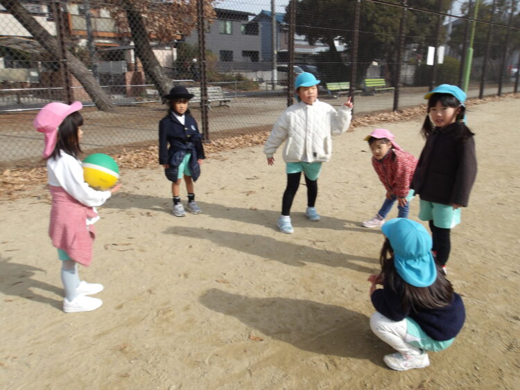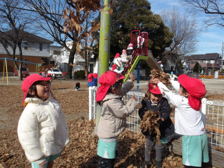 他にも枯れ葉🍂を空に向かって投げました!「綺麗だね〜」と風で舞い上がる様子を見て楽しみました👀お友だちの頭にも降らせ、枯れ葉のシャワーを浴びました![]()