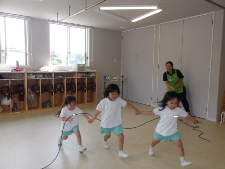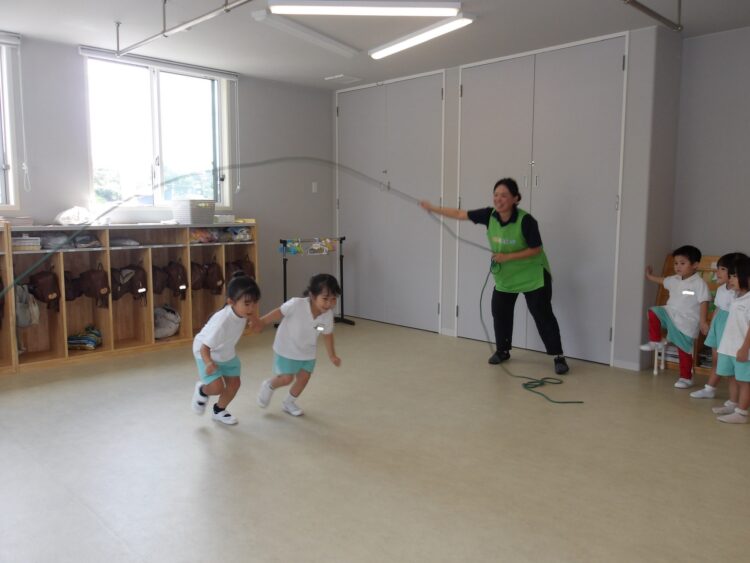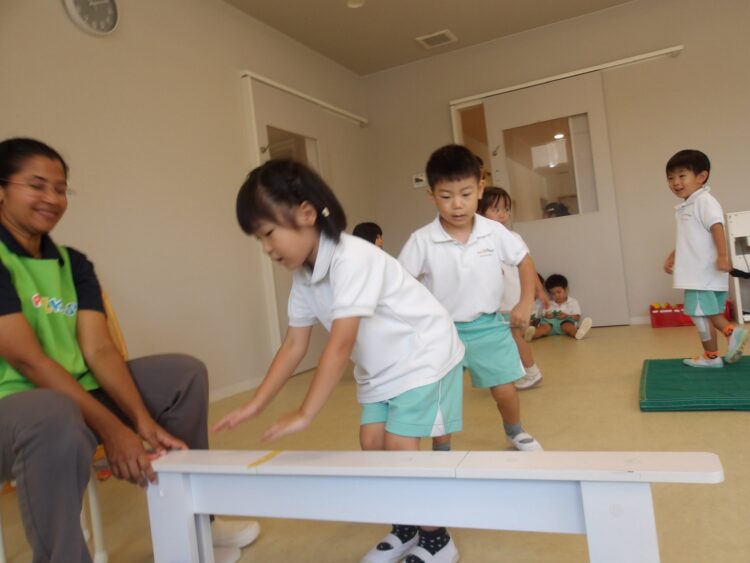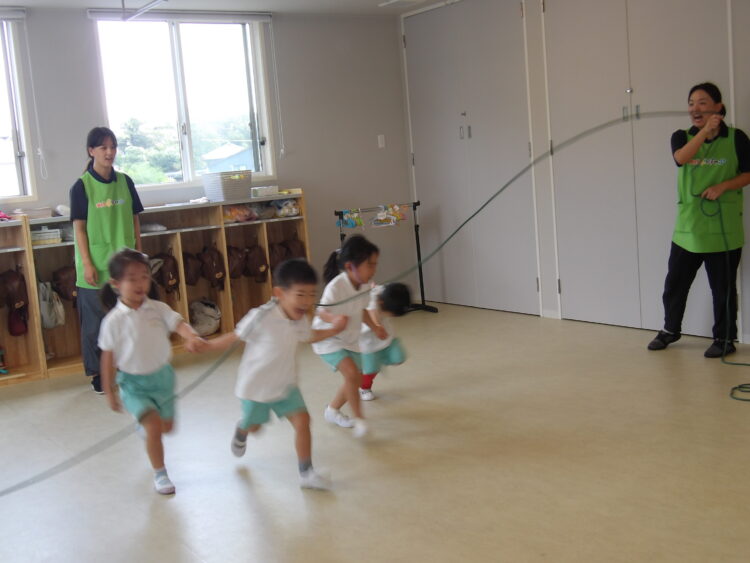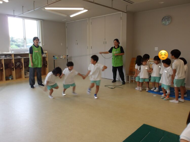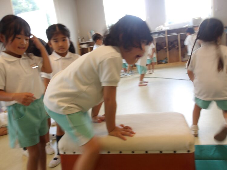 平均台や跳び箱をピョンと跳んだり、お友だちと手を繋いで縄をくぐったりジャンプしたり、たくさん身体を動かしました