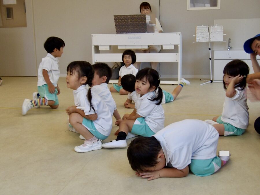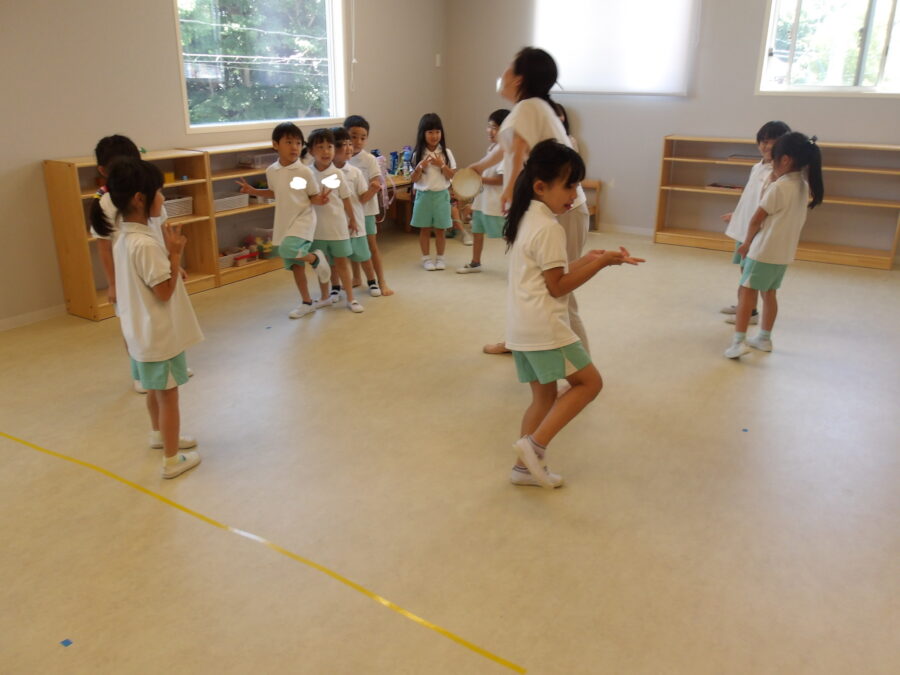 いろんな音を聞きながら、元気に歩くポーズ、雨の日の傘のポーズ、ジャンプなど楽しんで動いていましたよ