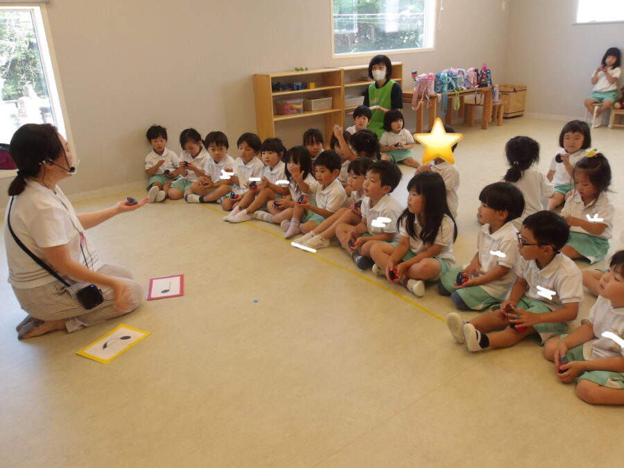 上手にできて喜ぶ姿も見られました🥰 次に2、3人1組になってリズムにあわしてハイタッチをしました たいよう組は円になりピアノに合わせて色々なポーズをしました カスタネットで上手に演奏できてました☺️ 色々な楽器を使って演奏もしました♪またリトミックしようね🥰