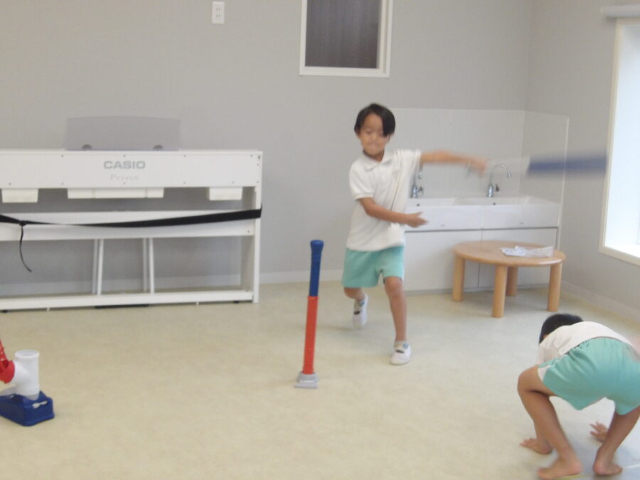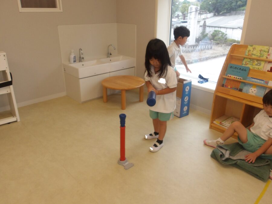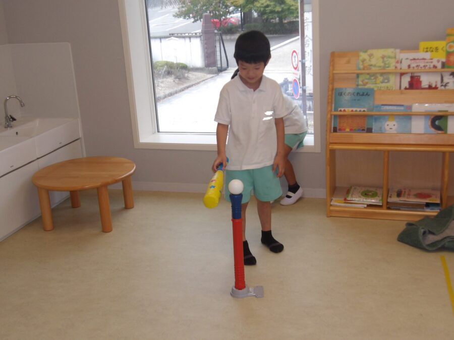 棒の上に置いて打つ子とボールが下から上がって打つ子の2つに分かれて打ちました💪