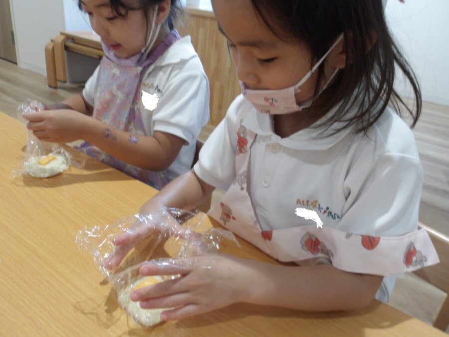 次にサランラップをひいて、先生が切ったチーズを中に入れました![]()