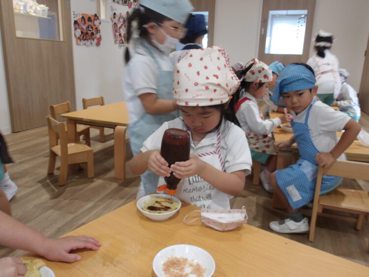 ソースと鰹節をかけてお好み焼き焼きを作りました✨