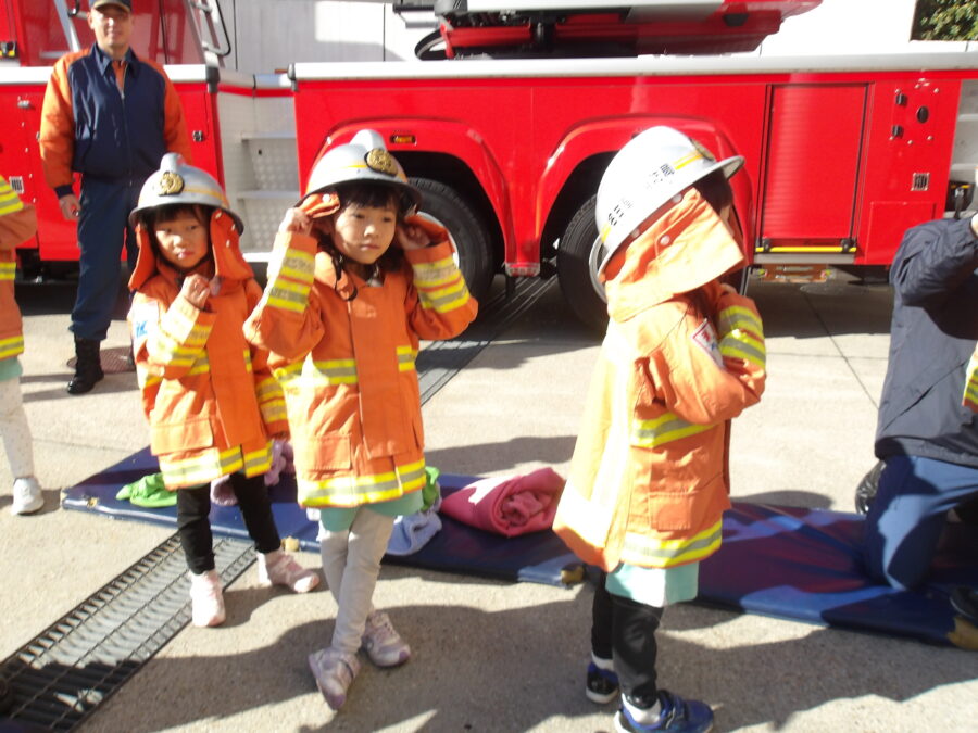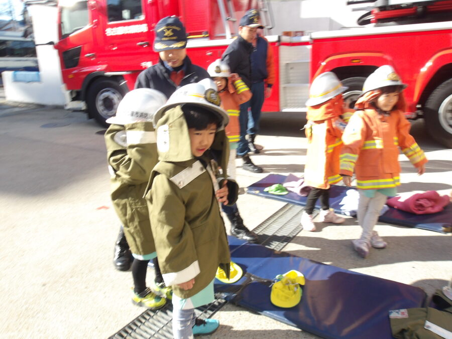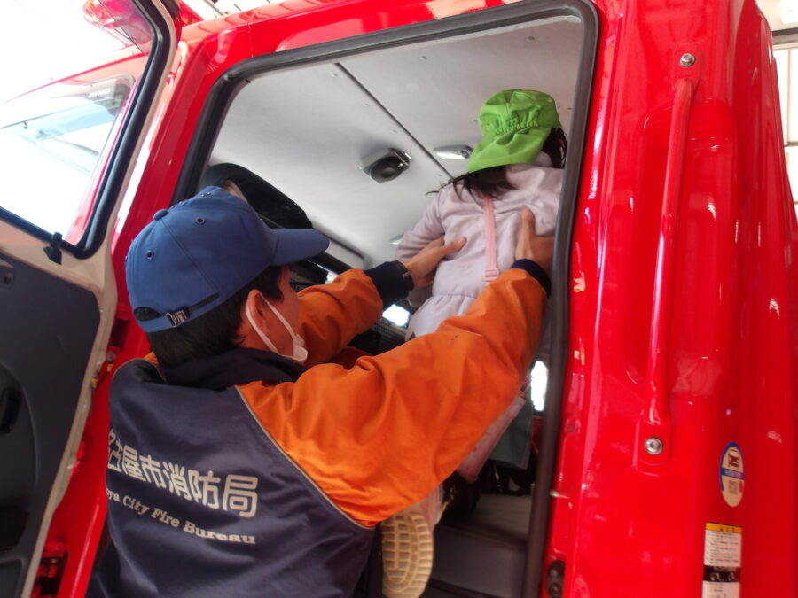 防火服を着て、消防車の中に乗せてもらったり、消火活動で実際に使うものを持ったり、触ったりさせていただきました🎵