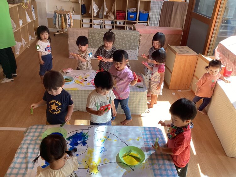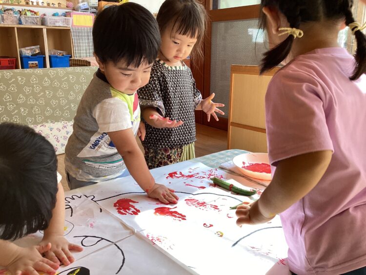 ばけたくんを変身させるのにみんなが育てたオクラをスタンプにしたり手形を押して変身させました![]()