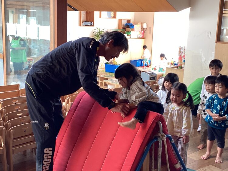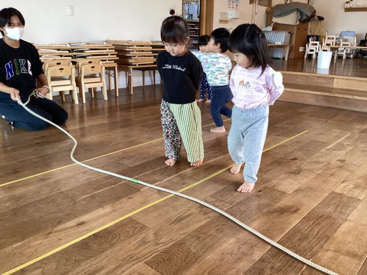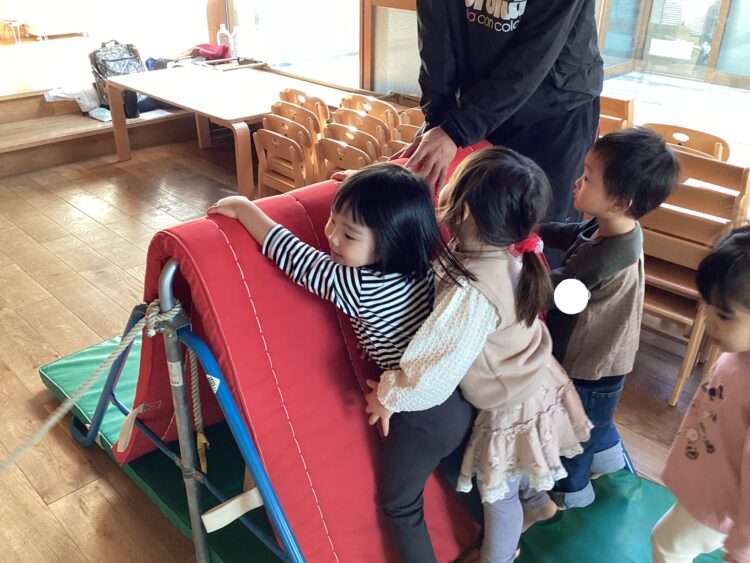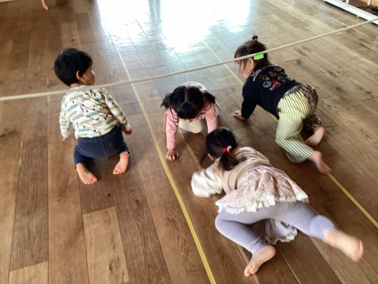 ロープをくぐったり、マットで作った大きな山を登ったり降りたり・・・。