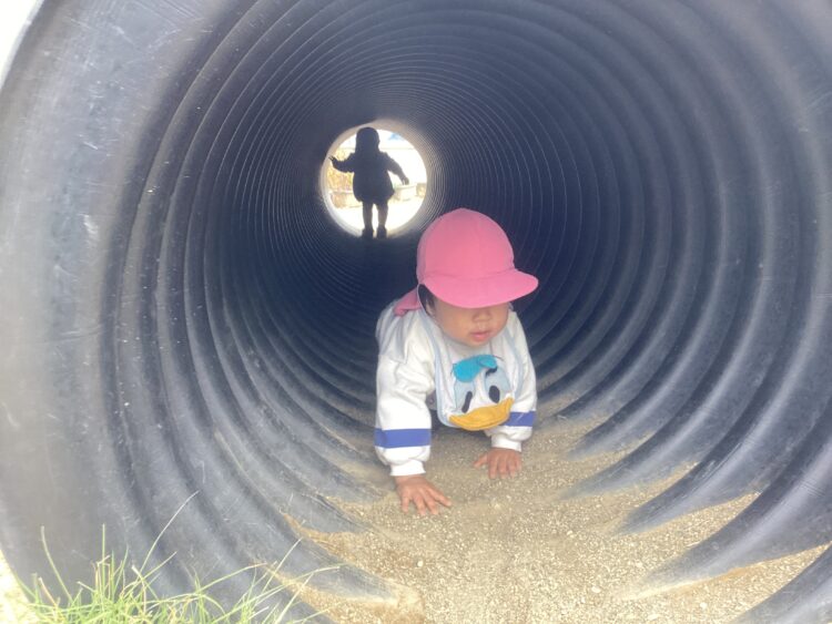 それからね 園庭のトンネルを覗いたら お友だちがちょうど出てきたところだったよ![]()