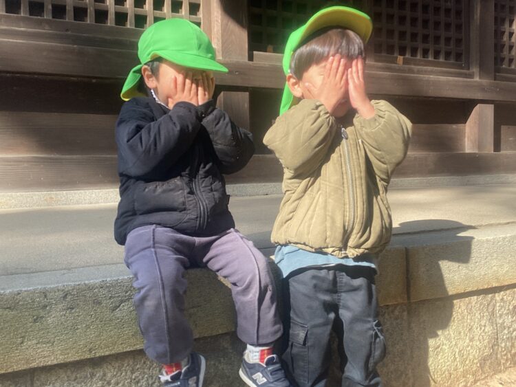 体操あそびの後は今岡神社へ行ってかくれんぼや木の実、葉っぱ拾いをしました!![]()