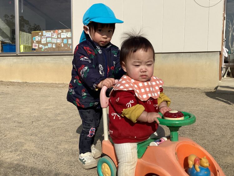 にこにこさん、すくすくさんは園庭でお砂場やコンビカーで遊びました![]()