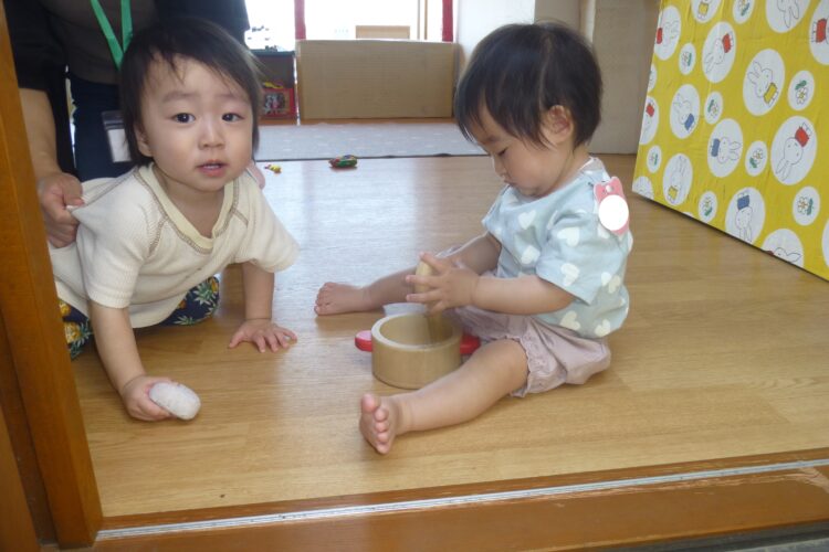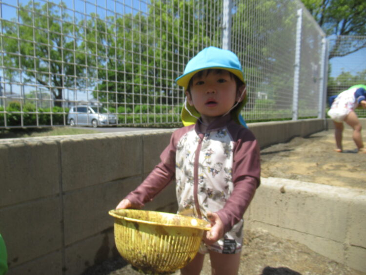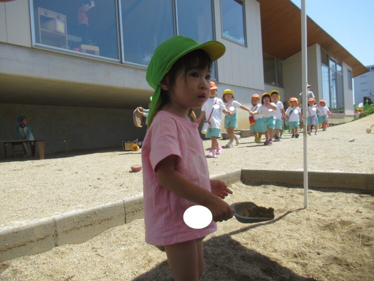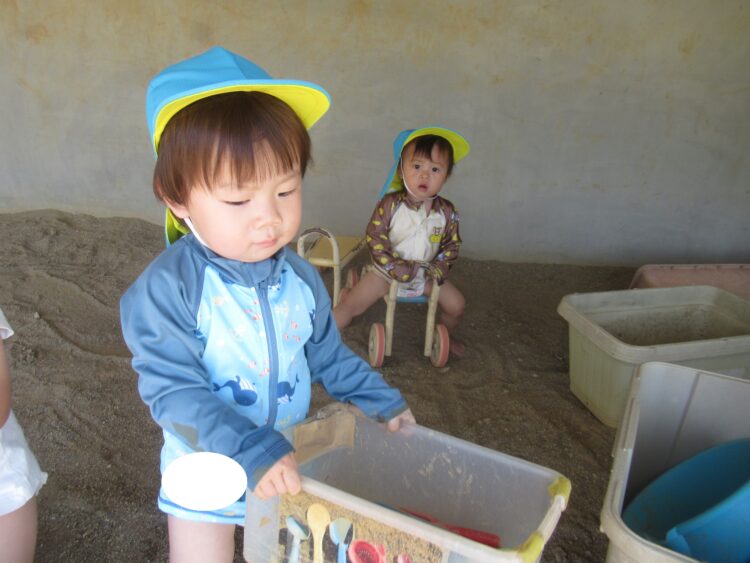 保育士がお水を用意すると、水たまりの中に足を入れてバタバタしたり、「お水ちょうだ~い!」と言って、ドロドロになった砂の感触を楽しんでいましたよ