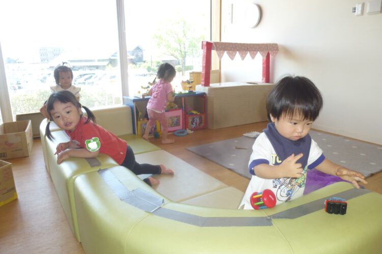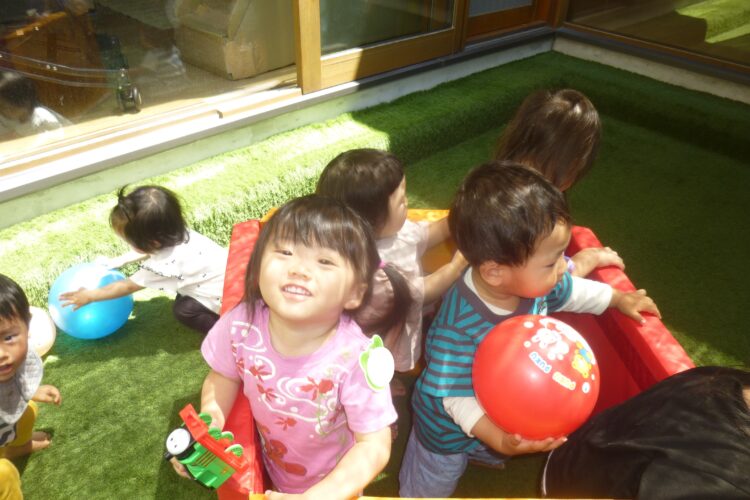中庭でボール遊びをしたりマットでお家を作ったりして楽しみました