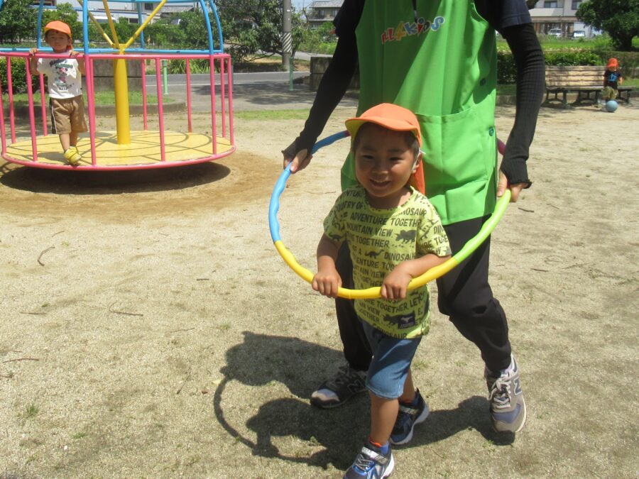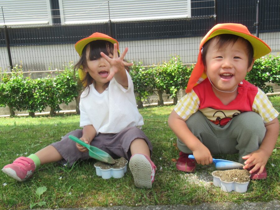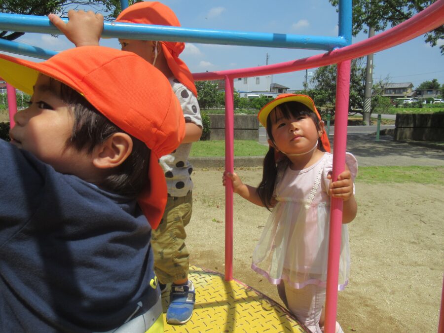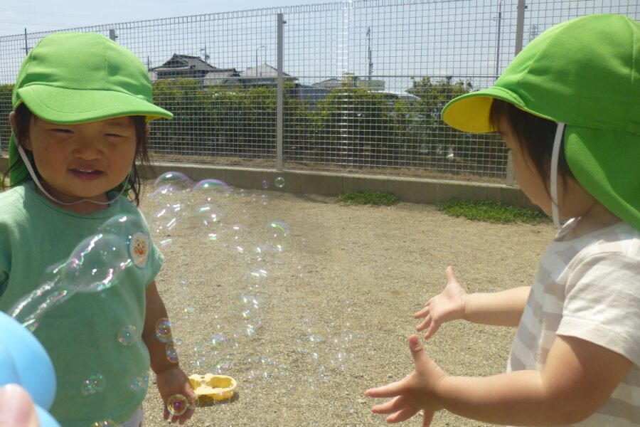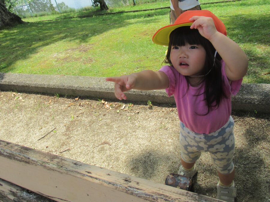 園庭でもしゃぼん玉やお砂遊びやコンビカーに乗って遊びました![]()