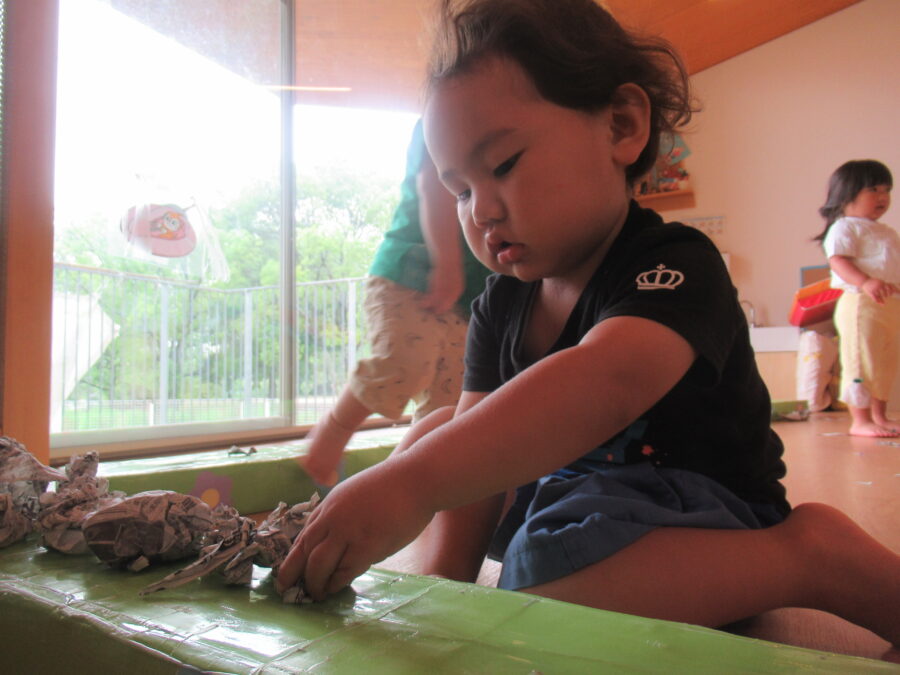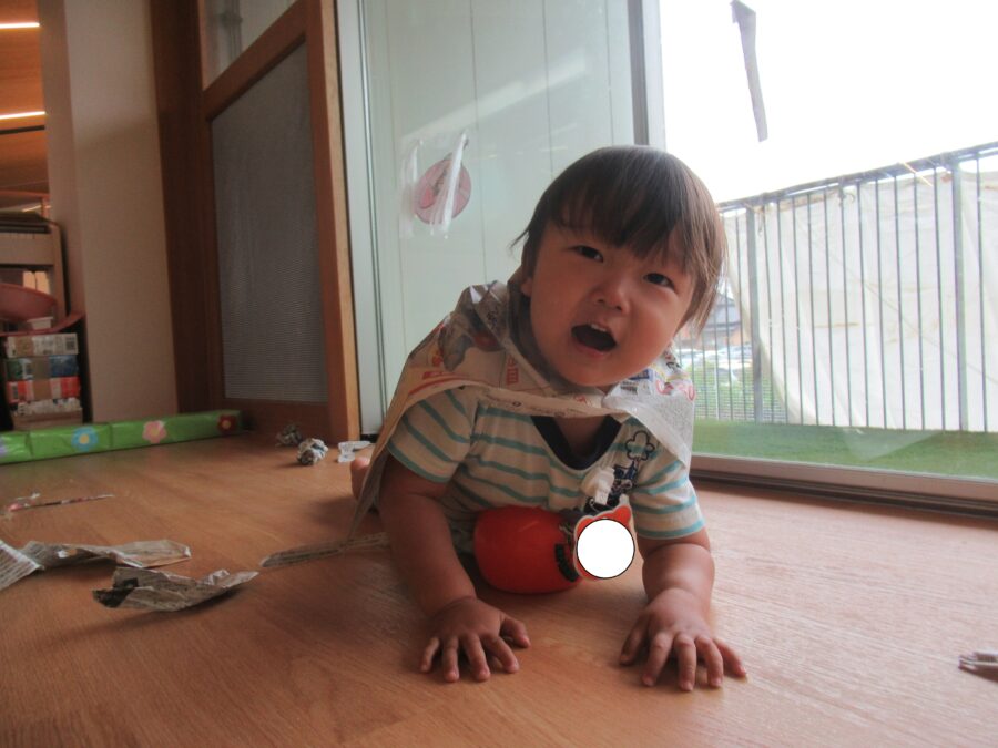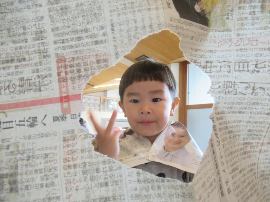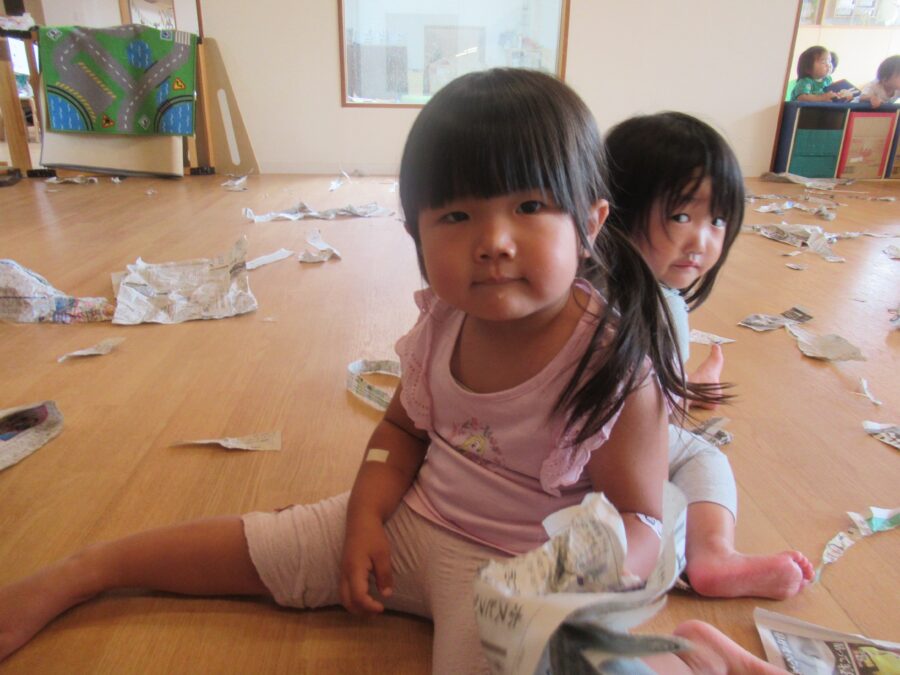今日はお部屋の中で新聞遊びをしました