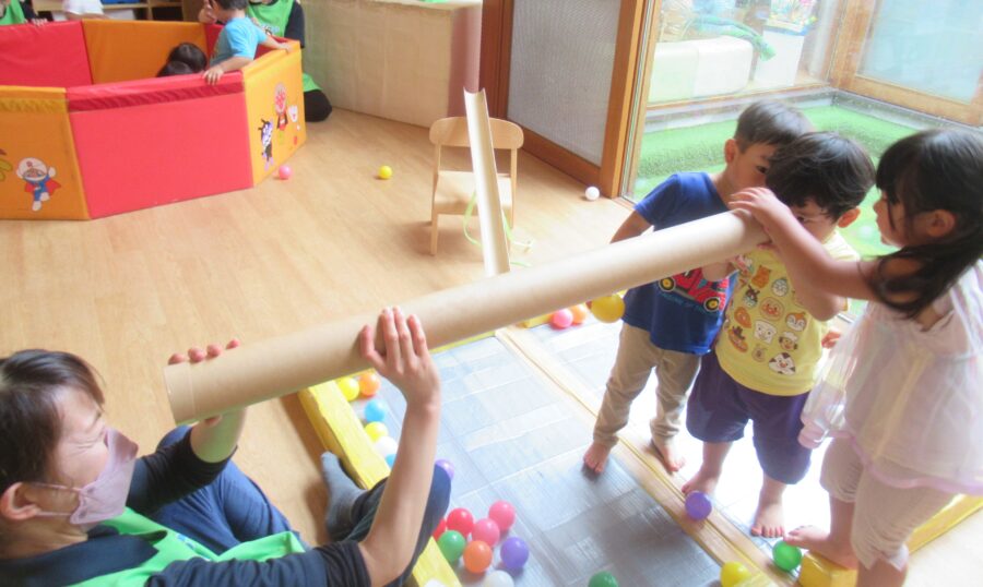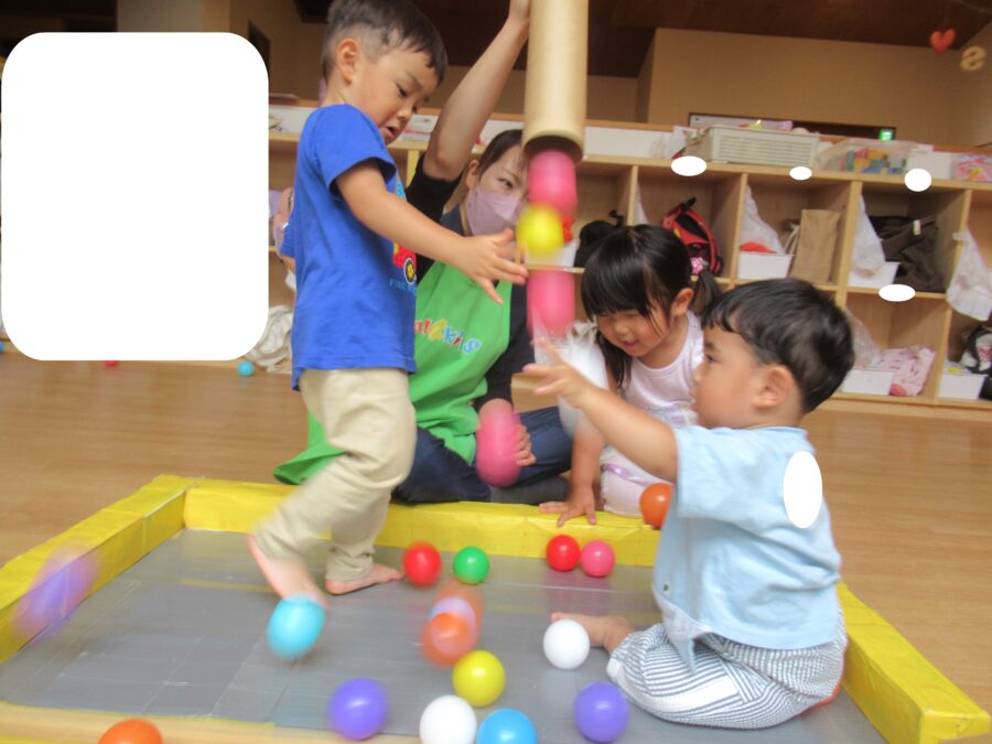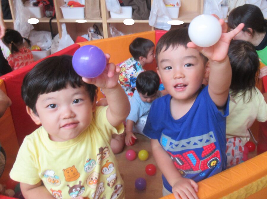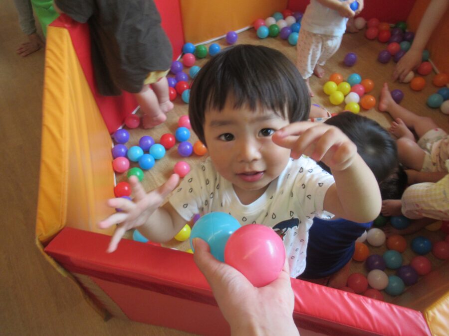 ボールプールでは、ボールを保育者にどうぞとしたり、
