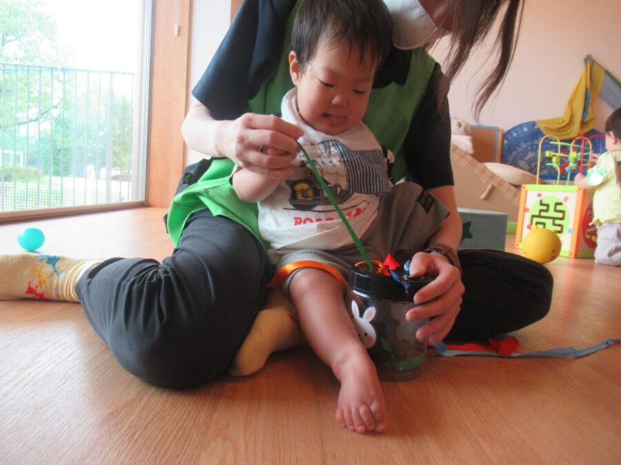 保育者と一緒に色がついているリボンを一緒に引っ張っていました🎀