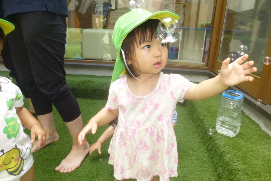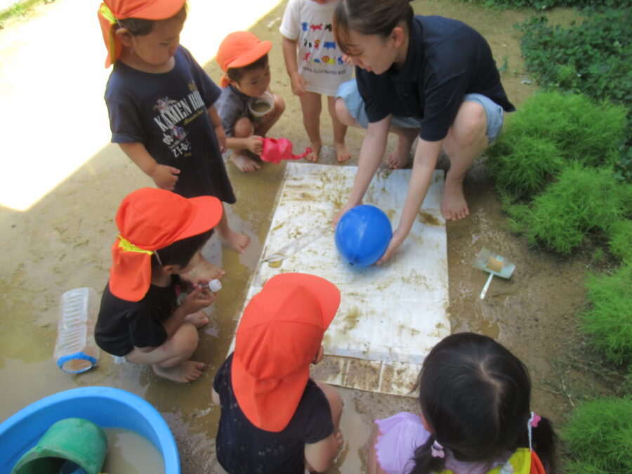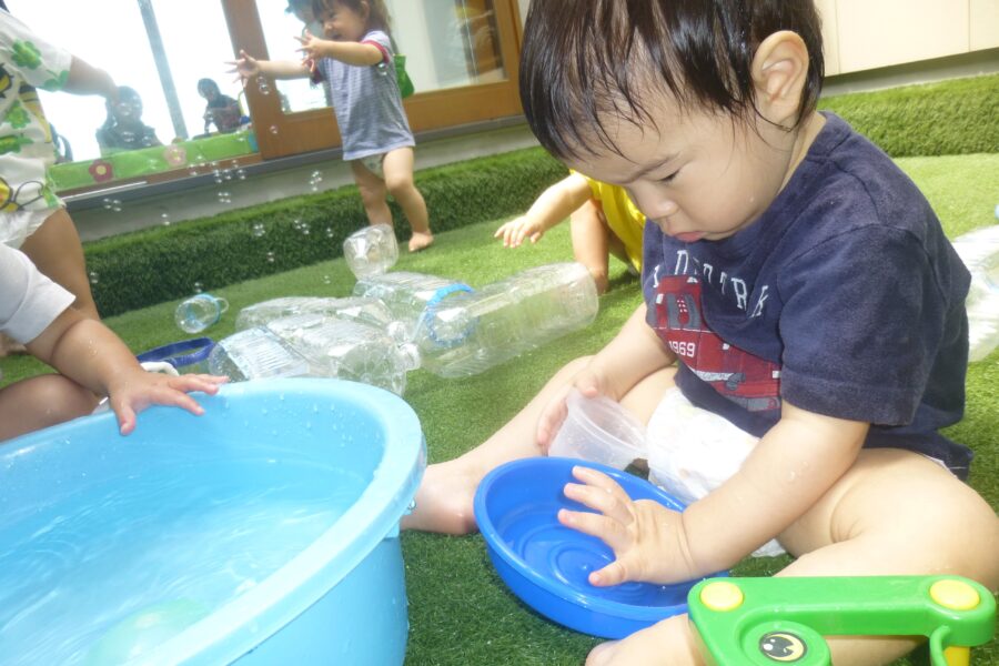 みんな、少しずつ水に触れることに慣れてきて、玩具や水にすすんで手をのばす姿がでてきましたよ![]()