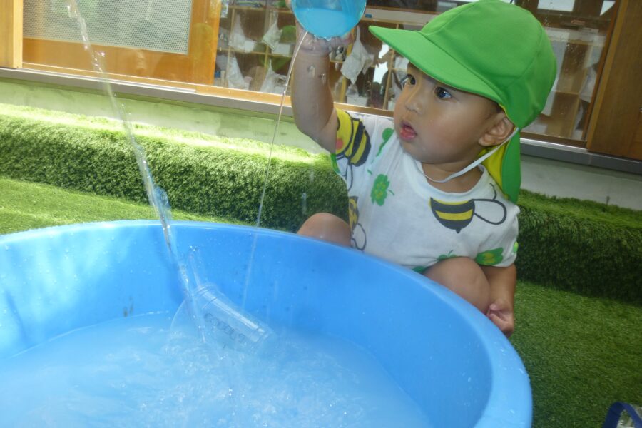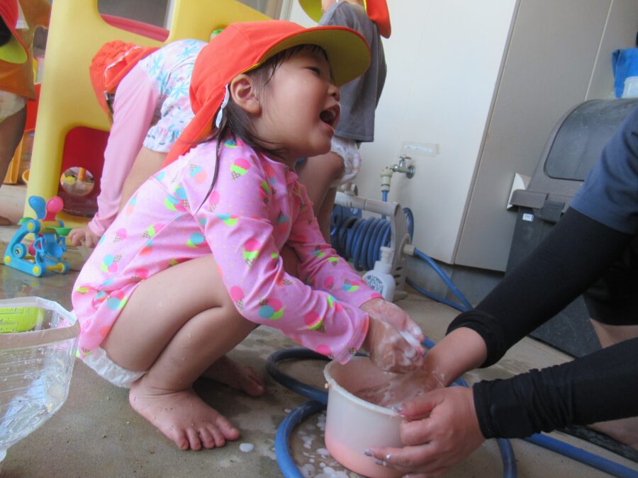 乳児園庭では、色水遊びをしました