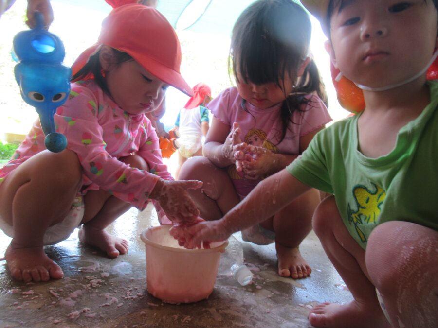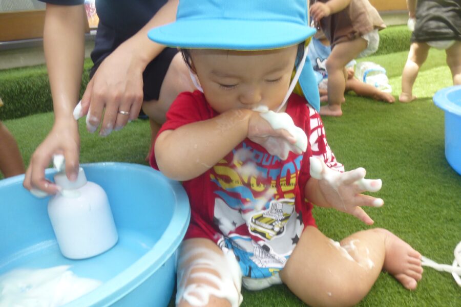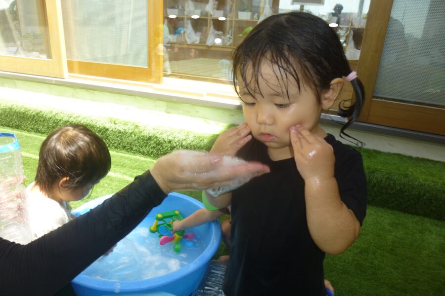 泡を体に塗ってみたり、触ってみたりと楽しんでいる姿が見られました👀