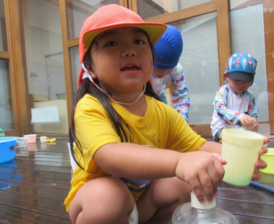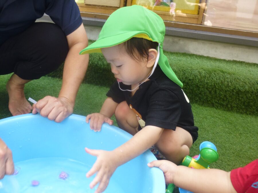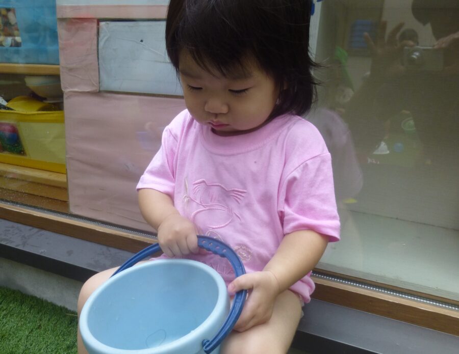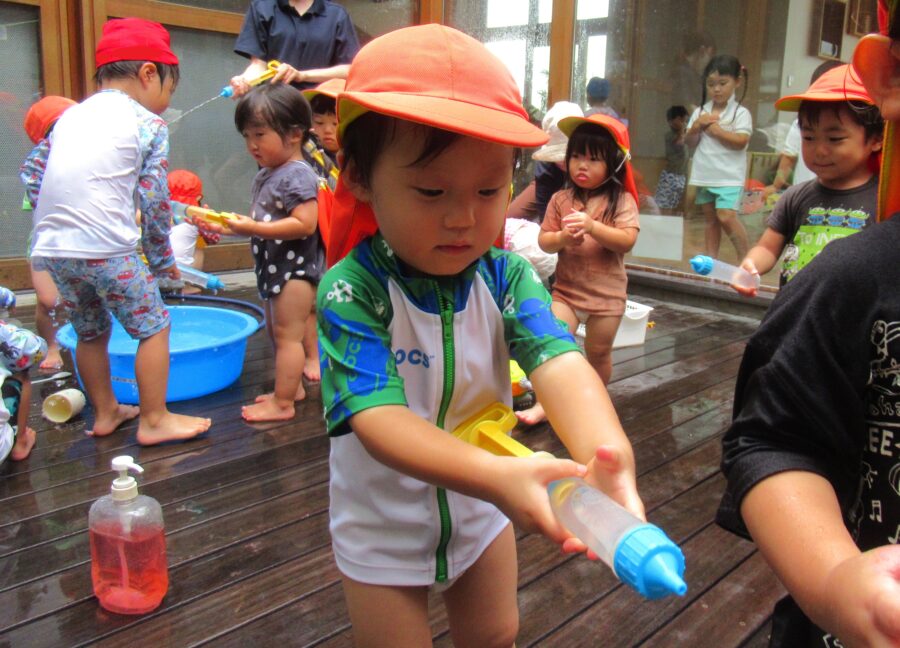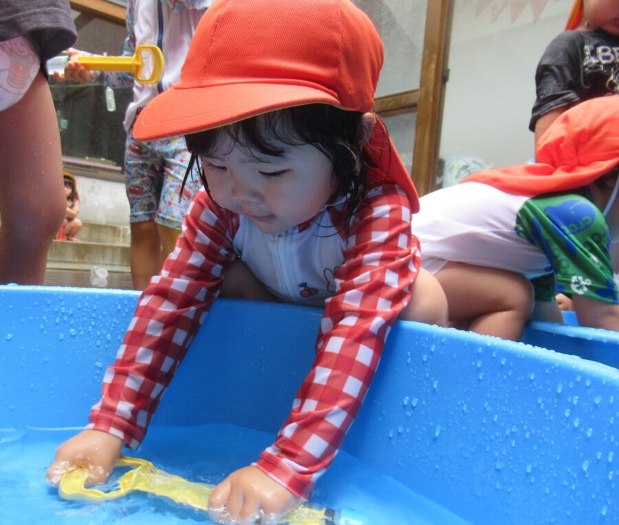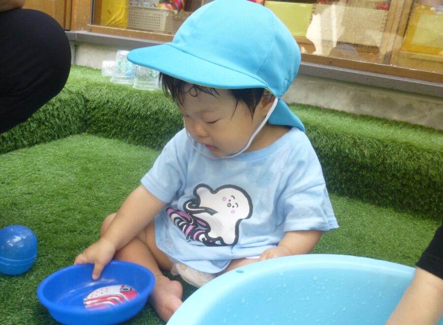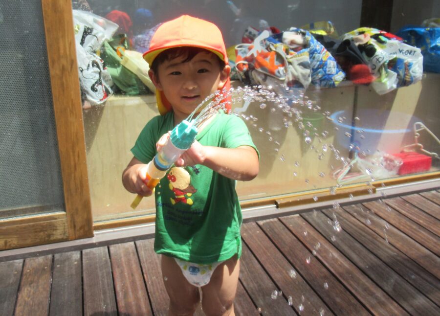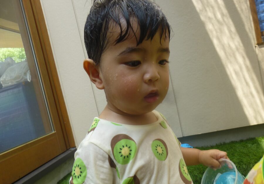 水に濡れるのが好きなようで保育者がシャワーを出していると近づいてきて自分から濡れています