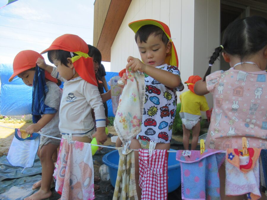 みんな夢中で、洗濯物を干しています。