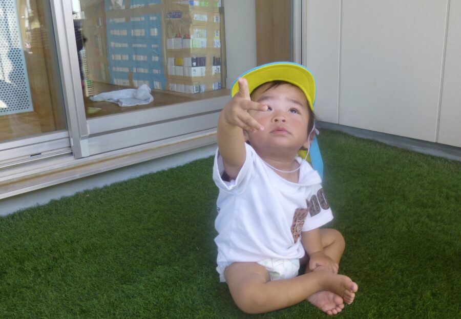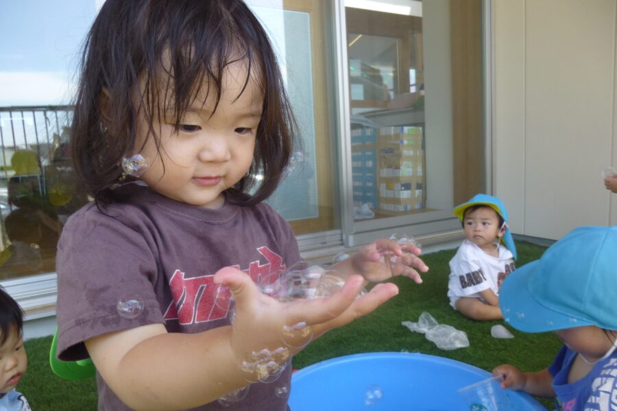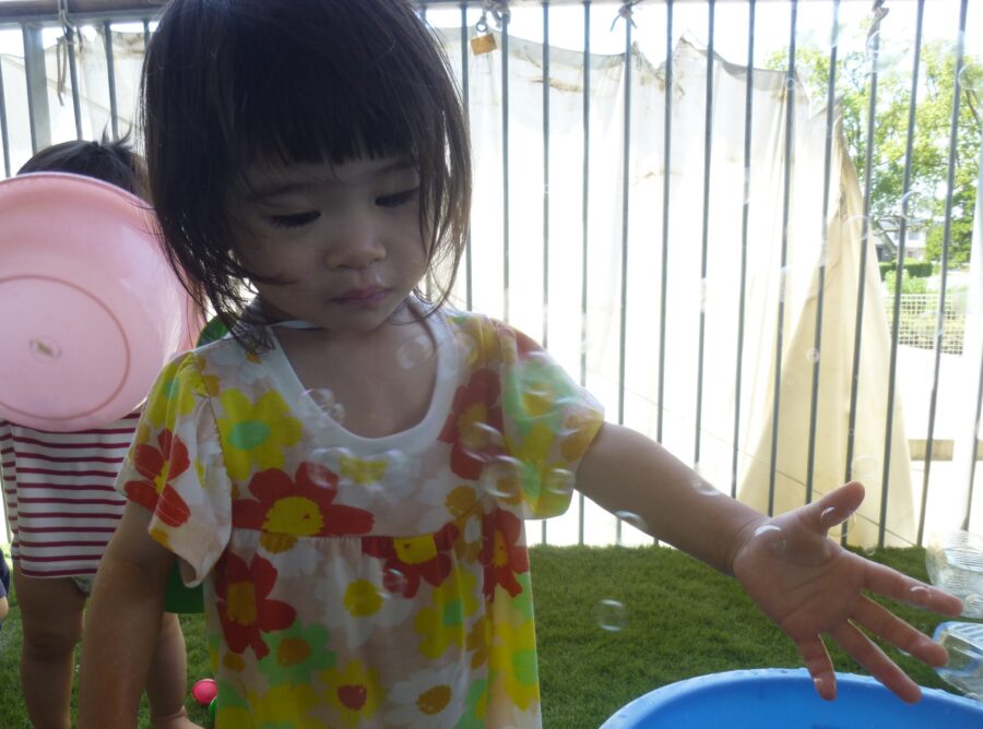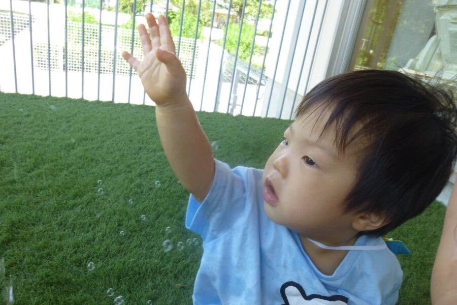しゃぼん玉を追いかけ、手を伸ばしてみたり、指さししてみたり・・・![]()