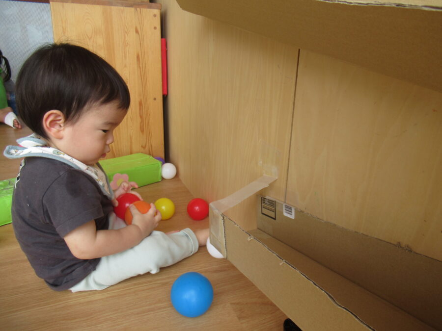 壁に段ボールを貼って段ボールの上をボールがコロコロ