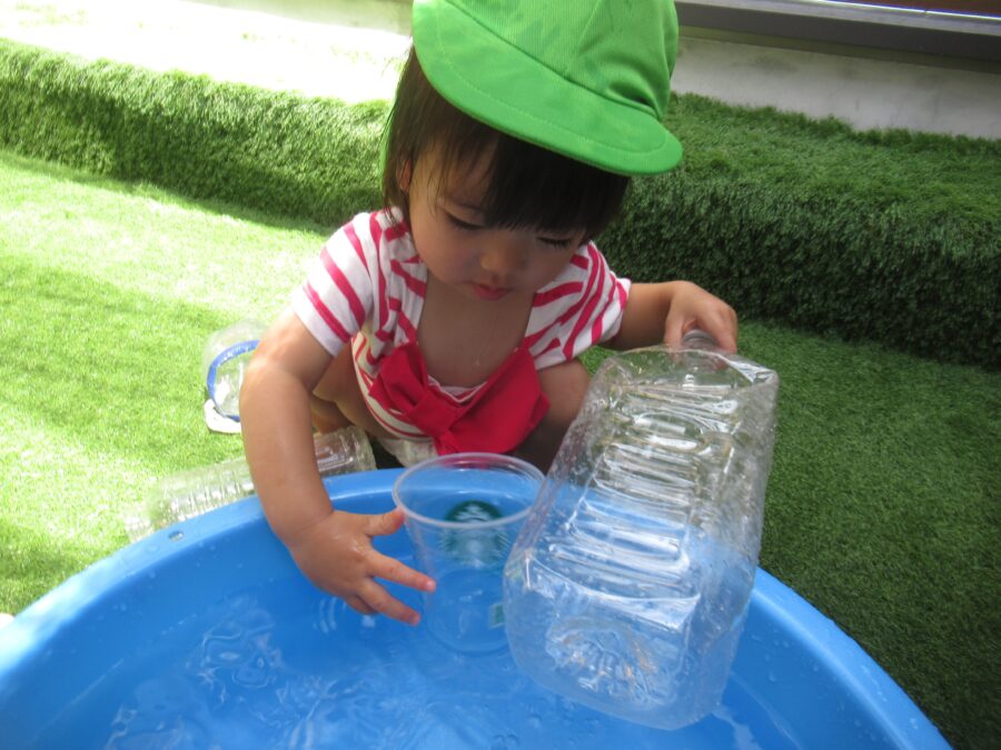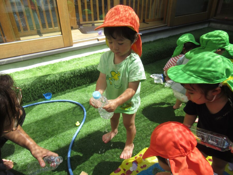 中庭ではペットボトルを押すとお水が出る遊びをしているようです![]()
