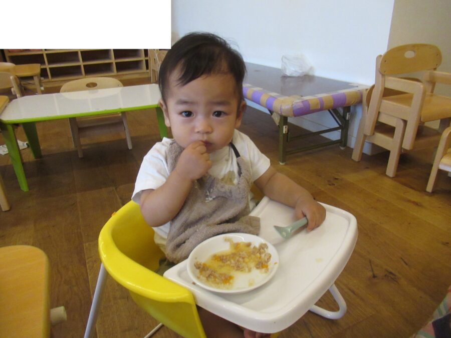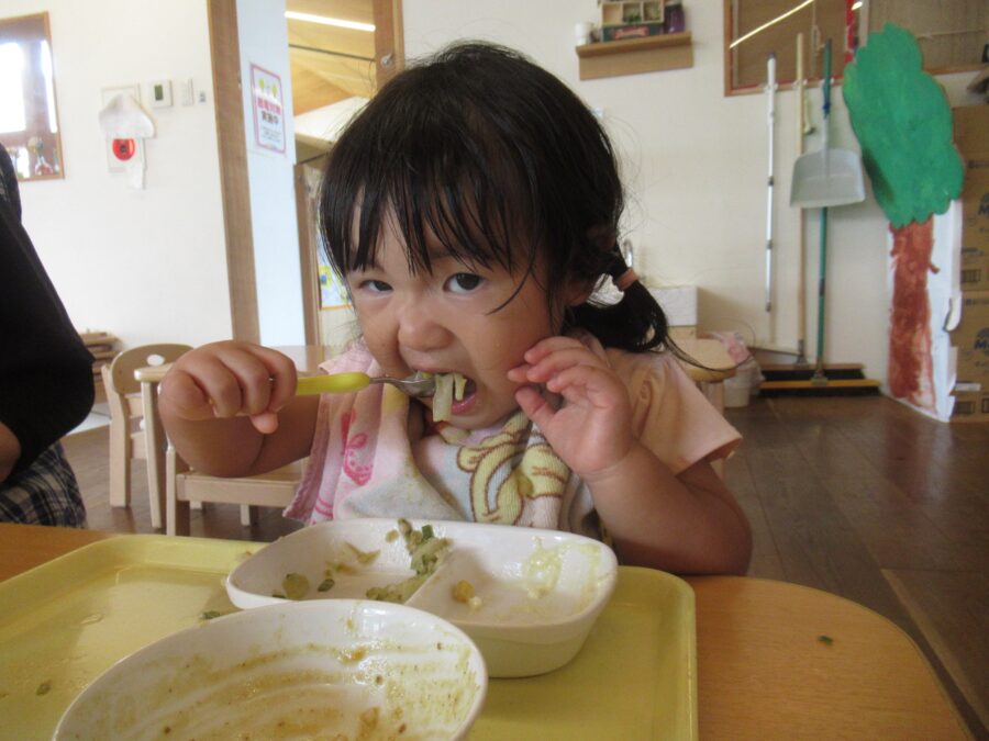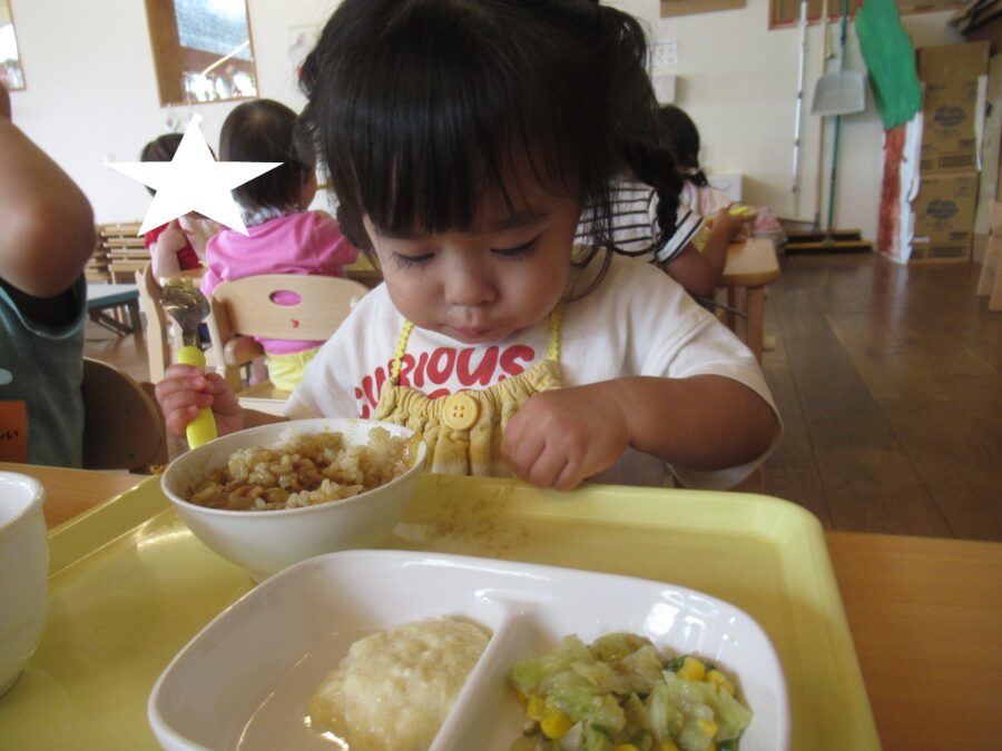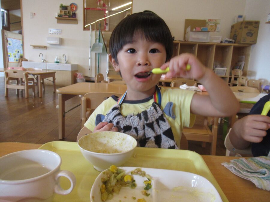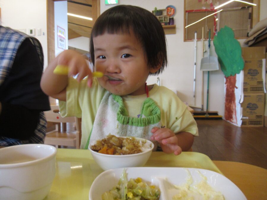 すくすくさん・のびのびさんも給食がカレーライスであることを知って、席に着くと同時に食べ始めていました