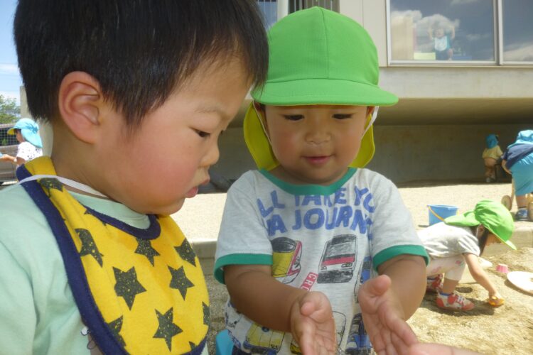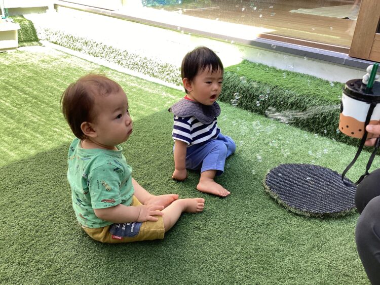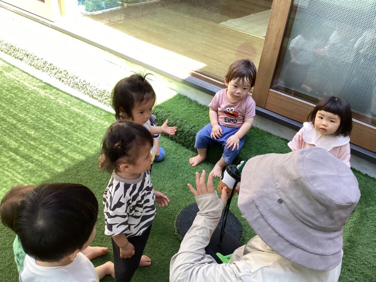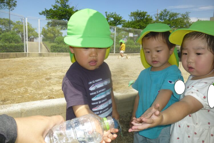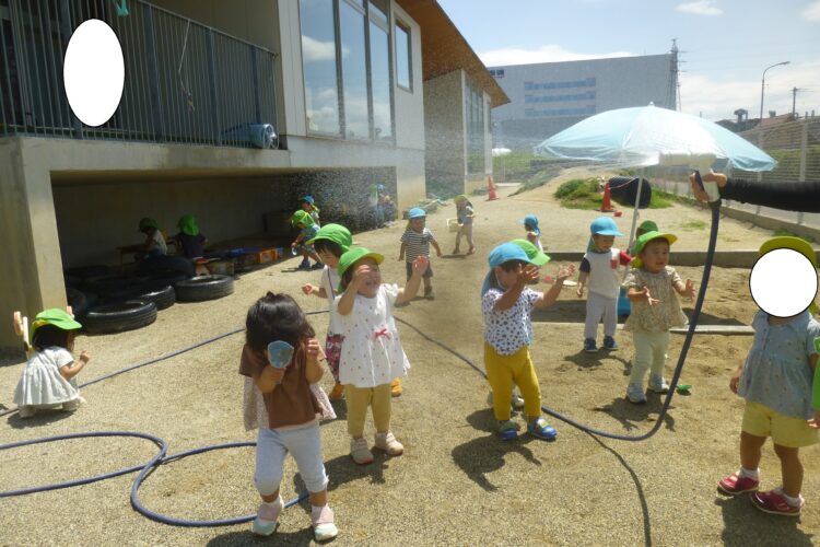 保育者がホースでミストをまくと子どもたちは「キャー!!」と大喜び