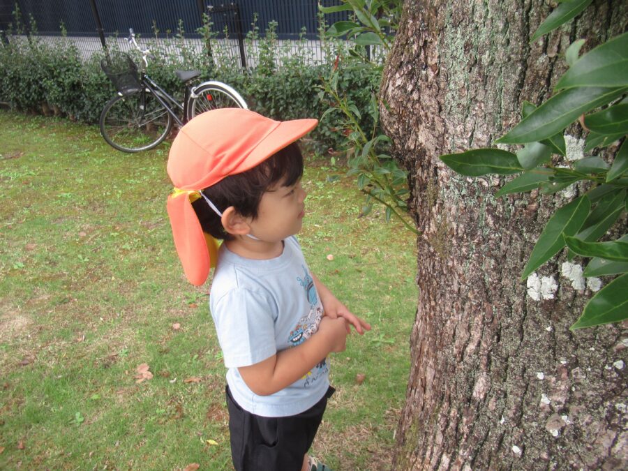 こちらのお友だちは、木の後ろに立って、何をしているのかな![]()